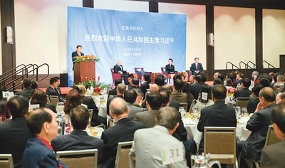 美国侨界代表致辞,热烈欢迎习近平和夫人彭丽媛,表示华侨华人虽身在海外,但根在华夏,情系祖国,将一如既往全力支持祖国发展和统一,为促进中美两国友谊和合作作出更大贡献。习近平主席带来祖国发展的喜讯,令人倍感振奋。在美华侨华人希望中美携手并进,共同繁荣,共建和平世界。