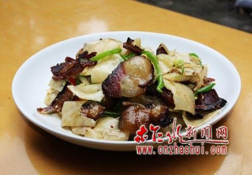 芋粉炒腊肉是柞水的传统名菜,腊肉香而不腻,芋粉滑软爽口,是佐酒的佳肴。《重修县志》中有载“年节时,家稍宽裕者,无不宰猪,腌以盐,熏以烟,即为腊肉”。柞水的芋粉炒腊肉不同与饭店、宾馆里的腊肉炒粉带,它是选用上好的腊肉和洁白的洋芋粉精工细作而成。将选好的腊肉,最好是猪后臀肉,肥瘦都有,用温水洗净,放在铁锅里煮熟,切成薄片待用。洋芋粉放大碗内,放盐、水适量,鲜蛋一枚,搅拦成糊状。锅置火上,把粉糊制成硬币厚的粉皮,将其切成菱形方块待用。置炒锅,放腊肉烤炒,沥出油来时,放葱、姜略炒,再放青椒、粉皮翻炒,出锅时放蒜泥即好。成菜香气四溢,爽滑可口,腊肉棕红,粉皮白中微黄,色美味香,营养丰富,回味悠长,是招待宾朋的首选菜肴。粉皮的厚薄程度,亦可展示主妇的厨艺。