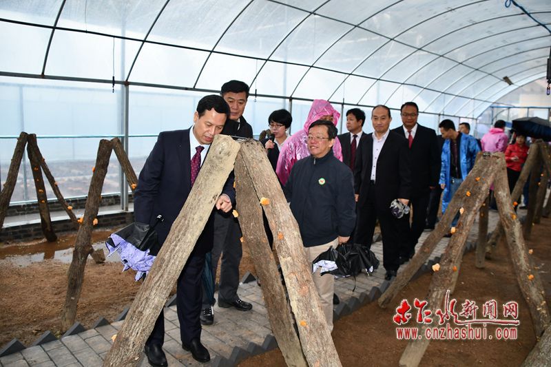 与会人员参观木耳小镇科技示范区、村集体经济吊袋木耳大棚区、农产品展销区、木耳博物馆