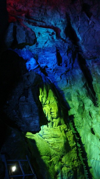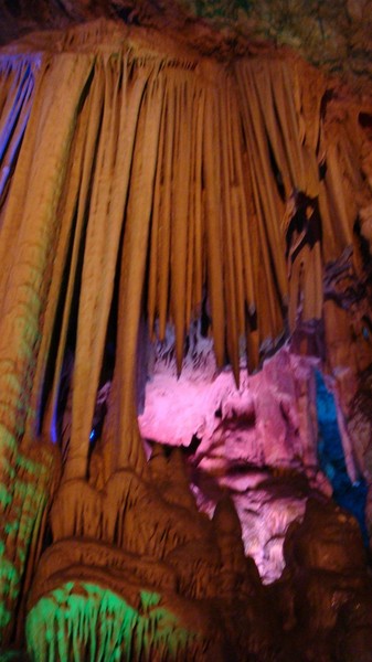整个游览时间不超过1h,实在是因为景区有点小。溶洞里很冷,幸好我有带外套,朋友一身夏天装扮,渗的够呛。溶洞里主要是石钟乳搭配着灯光,所以还算是漂亮。洞里随时都会有水滴落,石钟乳也是这样生长的吧。