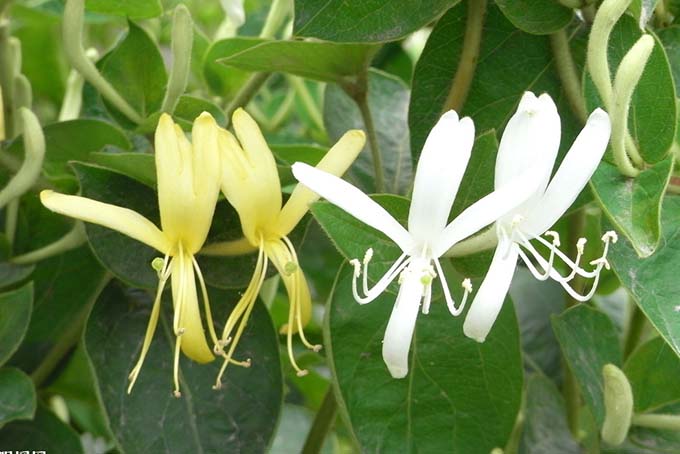 金银花,又名金花、银花、忍冬花,是“药用经济型、环保生态型”积一身的多年生藤本缠绕灌木,一直享有“四宝一枝花”的美誉。明代医学家李时珍在《本草纲目》中曾记载有“三日开花,长寸许,一蒂两花,花初开放白色,二、三日后变黄,黄白相映,新旧相参,故称金银花”。