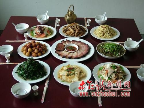 4、热菜 为本席面的中心菜。上菜次序为先大碗后大盘,盘跟大碗交替而上,大碗规定为鸡、蹄、肚、肘,大盘一般为柞水大炒、小炒、鸡蛋闷子、甜糟肉等,也可上其它特色菜,以四盘为限。如大碗扣土鸡,用当地鸡切块,底垫豆腐片、莴笋胡萝卜片、白菜片,最好是底衬板栗,加葱等佐料,扣碗上笼蒸。碗大,汤宽,鸡汤加汁,汤淳味清淡以尝到盐味为宜,肉鲜嫩,汤营养丰富,极富滋补养颜功效,为当地人惯吃口味。鸡肉味保健温补食品,富含蛋白质及丰富的维生素,是老年人和心血管病患者的理想食品。鸡肉味甘性微温,具有温中益气,滋补五脏,补精添髓等广泛的医疗功能。有俗话说,吃肉不如吃皮,吃皮不如喝汤。如柞水大炒,为当地自熏制腊肉切片混洋芋粉爆炒,腊肉肥瘦搭配相宜,瘦肉透红食之不柴有肉丝纹路。洋芋粉吸取肥肉油脂入口软又筋,透亮不腻。食此菜既解肚里无油之馋又耐饿止饥。